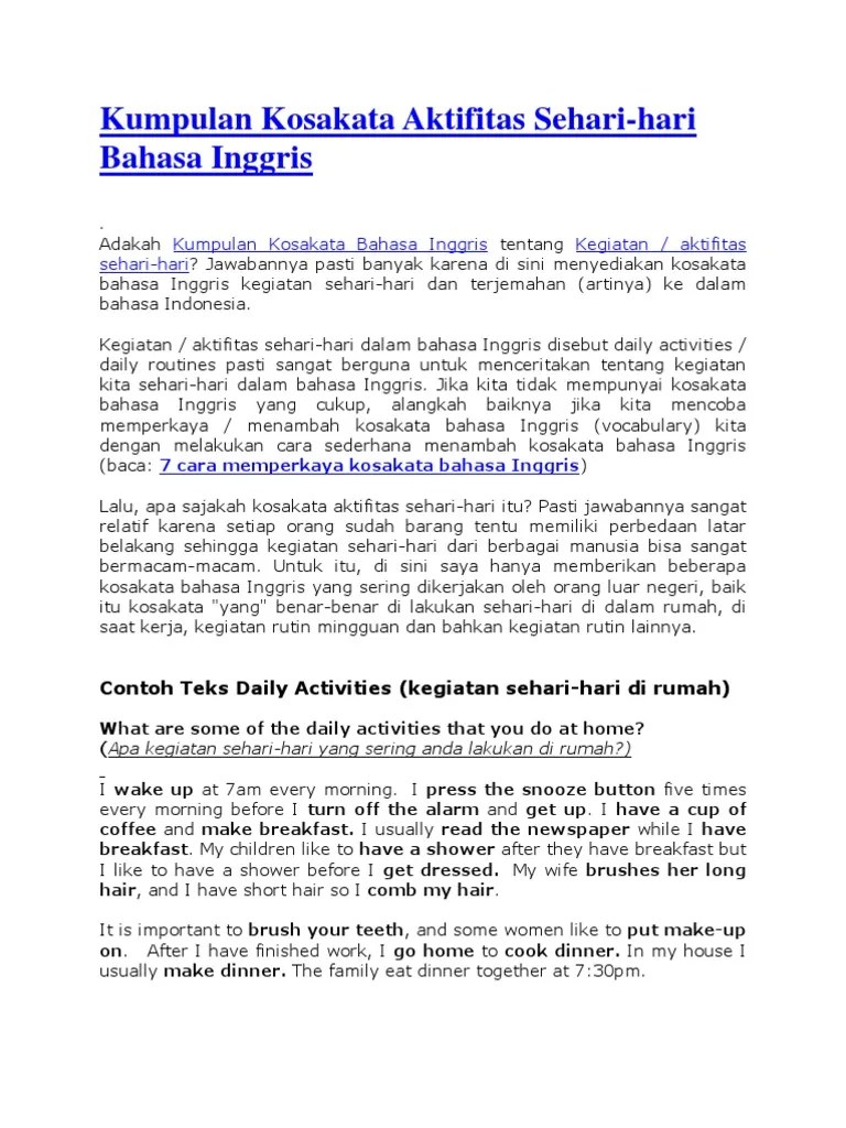 Seperti namanya, cerita tersebut memang memiliki alur cerita yang pendek dan disampaikan dalam bahasa inggris. For help people write their activity in english by sandi_wiguna_2 in types > instruction manuals. After that, i eat my breakfast. Next i put my clothes on and catch the . Turn off the alarm : Suatu hari, ada serigala yang sangat lapar. Caught the wolf and gave it nice beatings. Contoh daily activities adalah contoh kegiatan sehari hari bahasa inggris dari bangun tidur sampai tidur lagi beserta artinya. I get up early in the morning around 6am. First, i take a shower then i brush my teeth. Contoh kegiatan sehari hari dalam bahasa inggris lengkap dengan waktu · 04.00 wake up (bangun tidur) · 04.15 take ablution (ambil wudhu) · 04.30 prayer subuh ( .